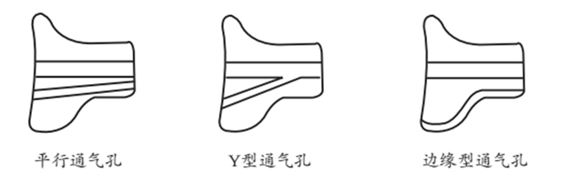 平行式通氣孔最容易理解,使用頻率也最高,但當耳道直徑比較小時,制作平行式通氣孔就比較困難了,其替代方法為邊緣型通氣孔和Y型通氣孔,Y型通氣孔只有在沒有其它選擇的情況下才使用,因為它會導致兩個嚴重的問題:一,高頻聲沿著聲孔傳播,在分叉處會被部分反射,這種反射減少了高頻增益;二,容易導致聲反饋。