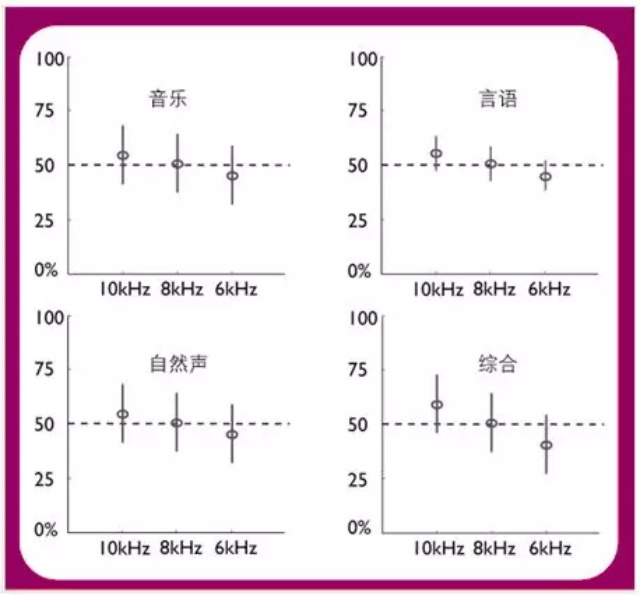 結果表明:言語信號、音樂信號和自然聲信號刺激下,佩戴助聽器高頻頻寬越高,聲音分辨越高。這意味著更寬的高頻補償,能夠幫助用戶提高聲音的分辨能力。如果是需要言語訓練的聽損兒童和需要學習不同語言的人士佩戴更寬高頻補償的助聽器,意義將會更加深遠!