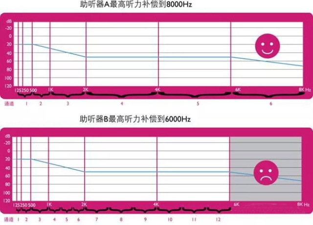 下面是一個常見聽力損失用戶的聽力圖,該用戶低頻較好,高頻教差。我們使用助聽器A和助聽器B分別補償用戶聽力:助聽器A有6通道高頻高頻寬達8000Hz,助聽器B有12通道高頻頻寬6000Hz。大家注意觀察聽力圖上的高頻部分(用戶在6000Hz-8000Hz有殘余聽力),不難看出雖然助聽器B有12個通道,但無法完全按照用戶聽力圖補償聽力。所以,在一定程度下超級頻寬比通道數量在助聽器驗配中更為重要。