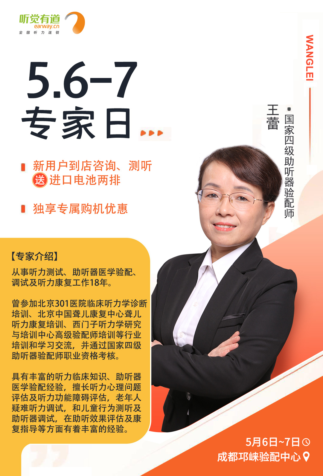 <span style="white-space:pre"> </span>為了更好地服務聽損人士,帶來高質量的聆聽感受,聽覺有道全國聽力連鎖將持續開展專家入店活動。<br /></span><p><span style="font-size:16px;"> 專家日現場,聽覺有道金牌聽力專家將為您解答聽力相關問題,調試和驗配助聽器,讓您能夠更好地聆聽這個世界的美好。</span></p><p style="text-align: center;"><img src="/upfiles/202104300114022603.jpg" width="640" alt="" /><br /></p><p style="text-align: center;"><br /></p><span style="font-size:16px;"> <strong>活動預告<br /><br /> 聽覺有道專家入店行程表</strong><br /><br /> 聽覺有道東莞塘廈驗配中心<br /> 時間:5月2日<br /> 專家:李冬根<br /> 電話:0769-87927386<br /> 手機:18923091281<br /> 地址:廣東省東莞市塘廈鎮塘廈大道中70-108號(水電三局對面)<br /><br /> 聽覺有道達州開江驗配中心<br /> 時間:5月6日~7日<br /> 專家:羅夢薇<br /> 電話:0818-8222079<br /> 手機:19182813889<br /> 地址:四川省達州市開江縣新寧鎮龍池街77號(開江縣人民醫院正門對面)<br /><br /> 聽覺有道成都邛崍驗配中心<br /> 時間:5月6日~7日<br /> 專家:王蕾<br /> 電話:028-88734181<br /> 手機:18908177682<br /> 地址:四川省邛崍市鳳凰大道484號高宇南庭(醫療中心醫院對面)<br /><br /></span><span style="white-space:pre"><span style="font-size:16px;"> 聽覺有道閬中張飛南路旗艦中心<br /> 時間:5月18日~19日<br /> 專家:王杰<br /> 電話:0817-6250177<br /> 手機:17398130629<br /></span></span><p><span style="white-space:pre"><span style="font-size:16px;"> 地址:四川省閬中市張飛南路126號(人民醫院正對面)</span></span></p><p style="text-align: center;"><img src="/upfiles/202104300134599048.jpg" width="640" alt="" /> <img src="/upfiles/202104300134592952.jpg" width="640" alt="" /> <img src="/upfiles/202104300134592080.jpg" width="640" alt="" /><br /></p><p style="text-align: center;"><img src="/upfiles/202104300135382254.jpg" width="640" alt="" /><br /></p><p style="text-align: center;"><br /></p>" />